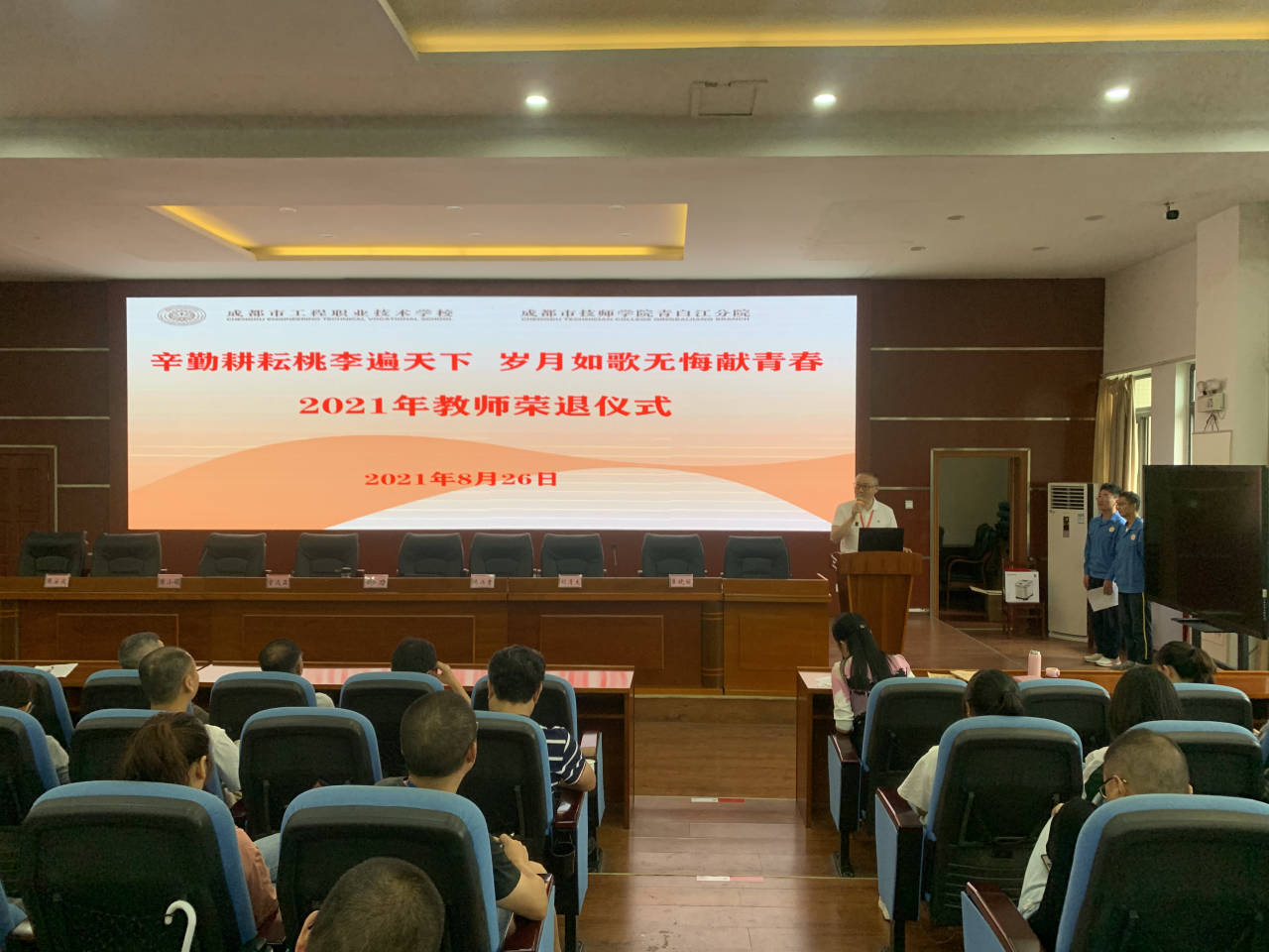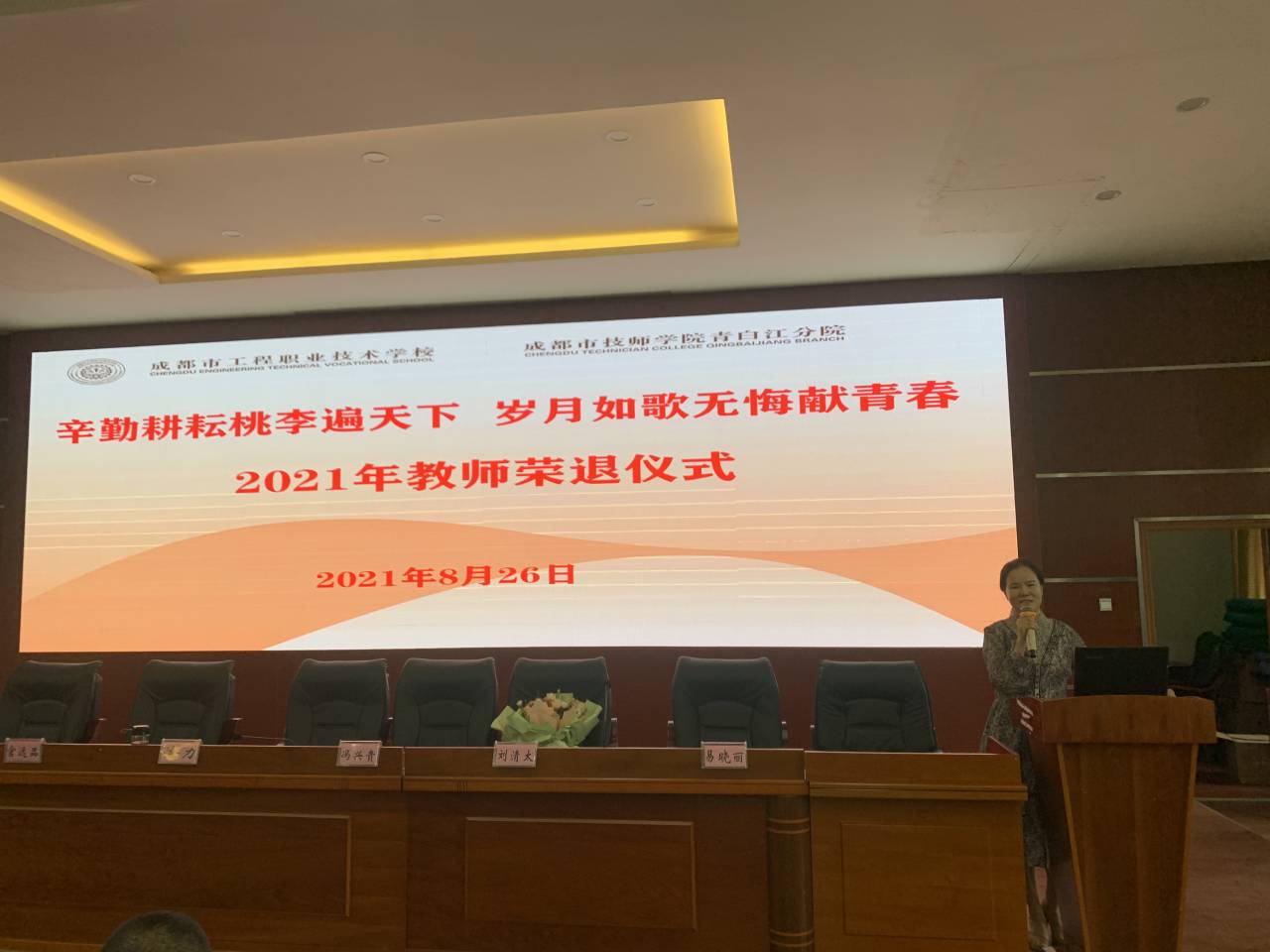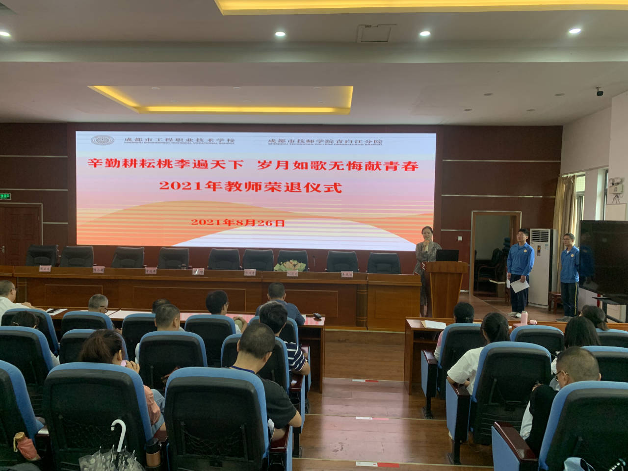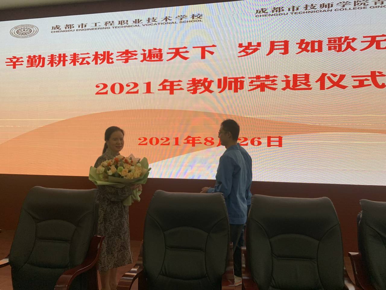 2021年8月23日,成都市工程职业技术学校、成都市技师学院青白江分院在祥福校区学术厅为退休教师李彩琼老师举行了一场朴实而又庄严的荣退仪式。校长徐力,副校长陈小娟、刘清太,全体行政和教师出席了荣退仪式。仪式由学校联合工会牵头组织,联合工会主席张安成同志主持仪式。