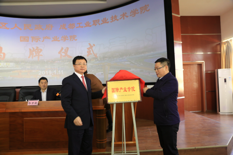 最后,成都工业职业技术学院党委书记姚凯、青白江区人民政府副区长杨军,共同为国际产业学院揭牌。