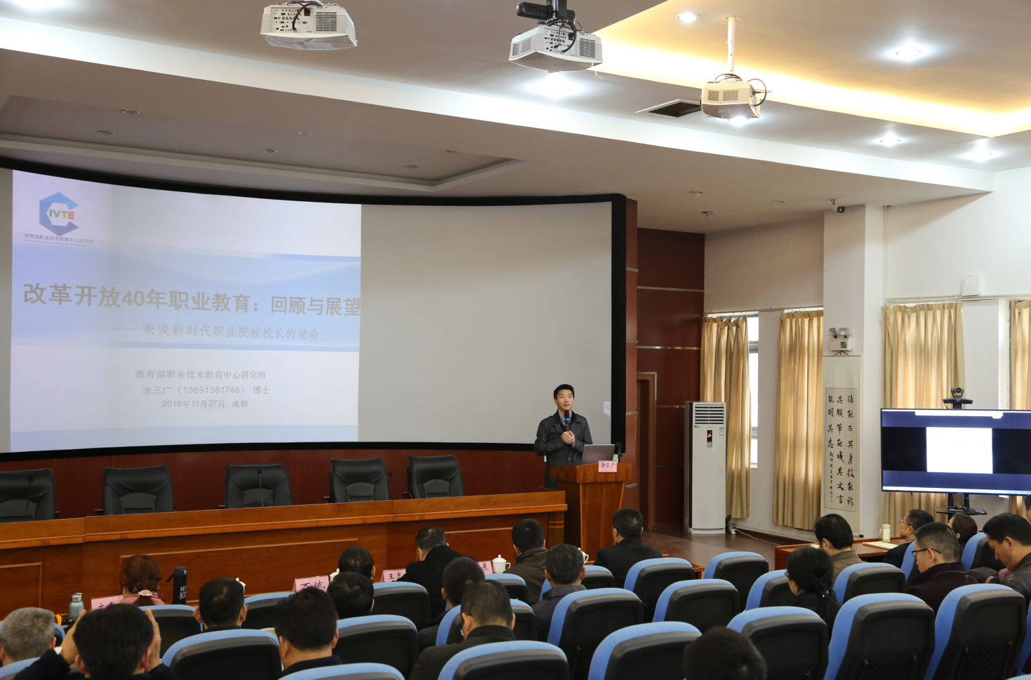 此次活动为期一天。在上午的职业教育校长座谈会上,国家教育部职业技术教育中心研究所的涂三广博士首先做了题为《改革开放40年职业教育:回顾与展望》的主题演讲,接着来自我校等6所职业院校校长以“优质领先   职惠未来—职业教育让城市和生活更美好”为主题分别作了交流发言。随后,与会领导们就会议主题分组进行了进一步探讨。