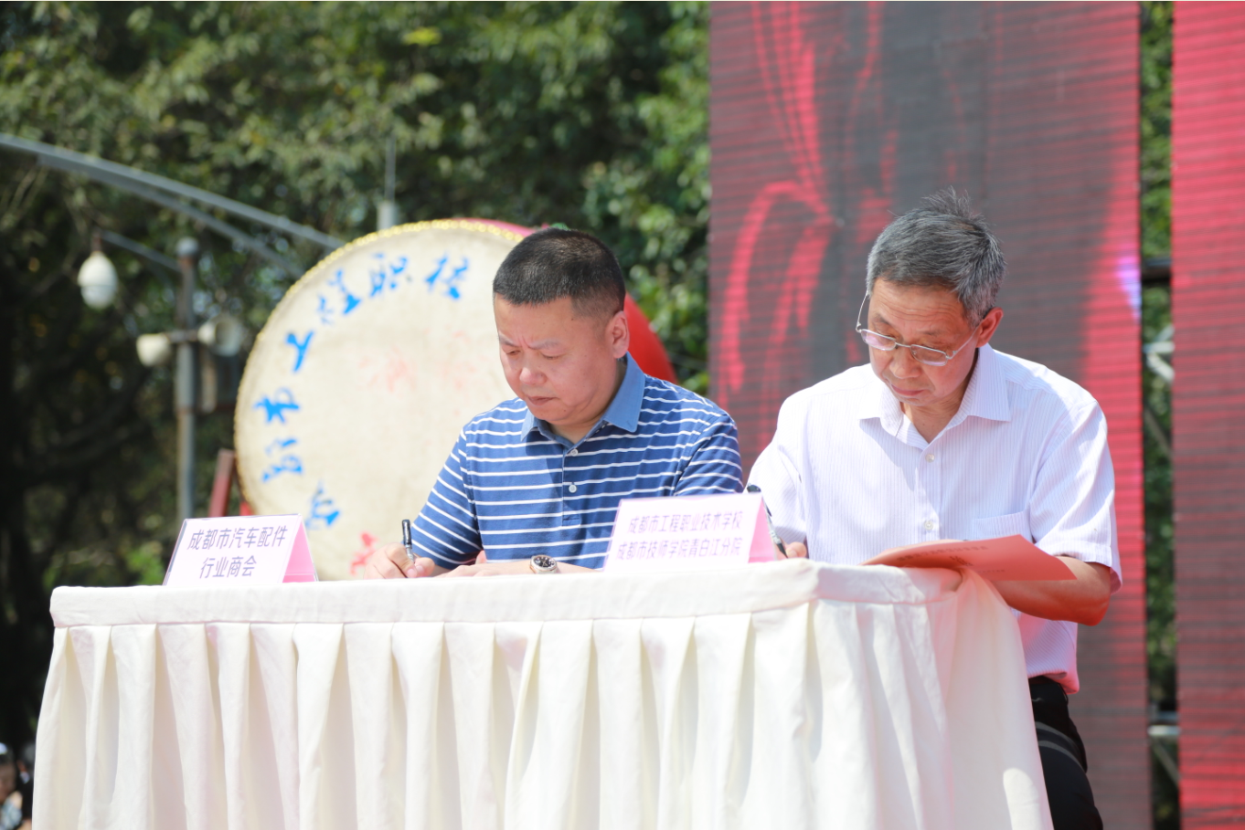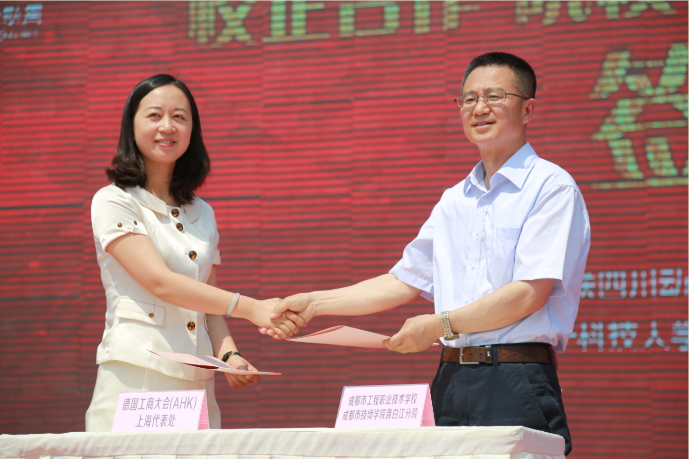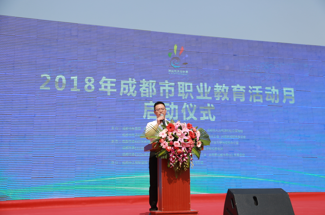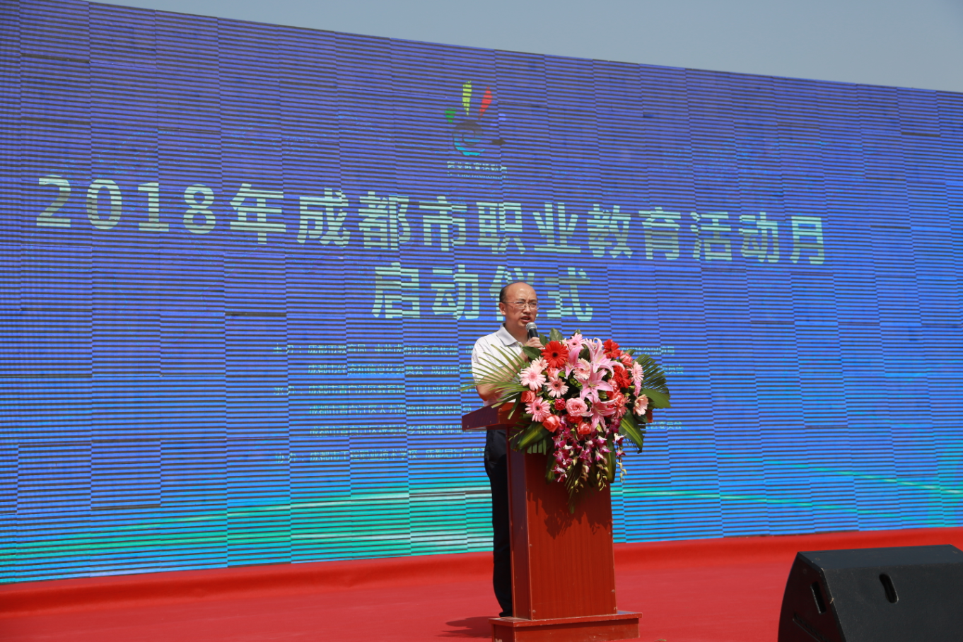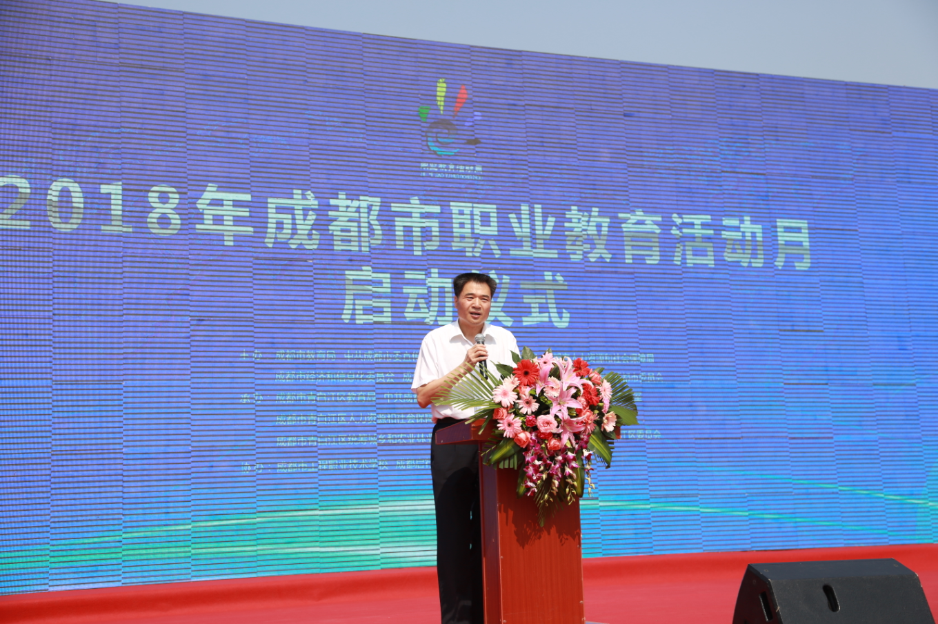 5月15日,2018年成都市职教活动月启动仪式在青白江区和谐广场举行。四川省教育厅职业教育与成人教育处处长蔡存明、成都市教育局副巡视员张平、成都市总工会副巡视员李永斌、成都市团委副书记夏小海、成都市教育局高等教育与职业教育处处长万斌、成都市委宣传部宣传处处长闵楠、成都市人社局就业局副局长兰琪、成都市经信委通用电子产业处副处长邓敏、成都市农委科教处研究员王春秀、青白江区政府副区长杨军、青白江区教育局局长郭万俊、青白江区人社局局长陈智彬出席了此次启动仪式,各区县教育部门、职业院校代表、企业行业代表、各公办职业院校校长、职业教育校企合作企业代表、师生代表以及群众代表等近千人参加。