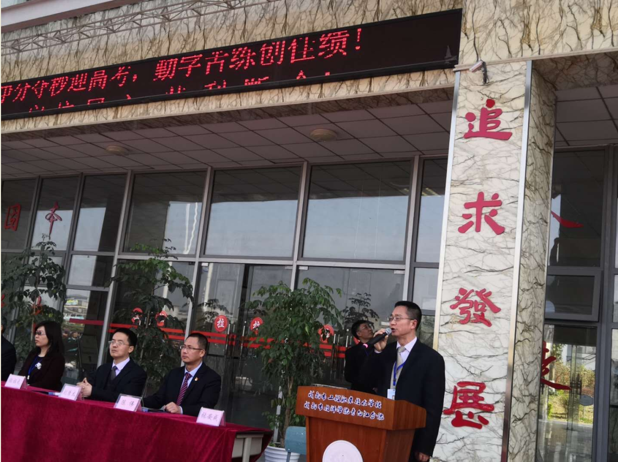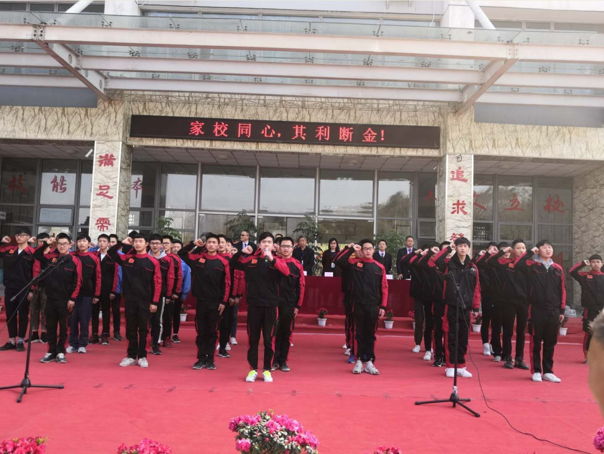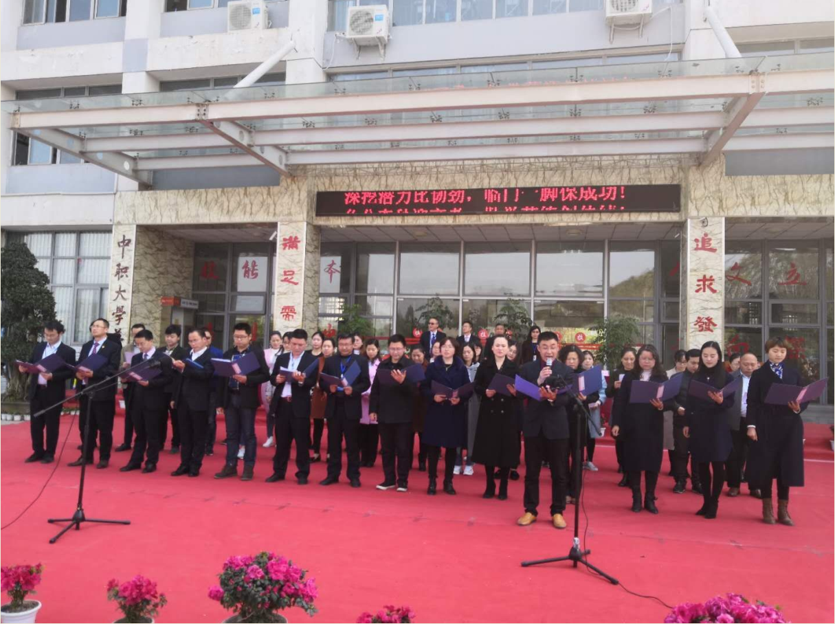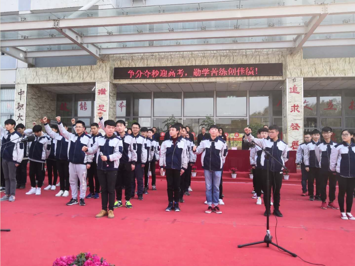 紧接着全体高三教师、高三学生依次上台作了庄严的宣誓。最后,仪式进入高潮,彭传章校长庄严宣布“成都市工程技术学校、成都市技师学院青白江分院2018年高考倒计时正式启动”,顿时校园内锣鼓喧天、彩带飘扬,掌声雷动。