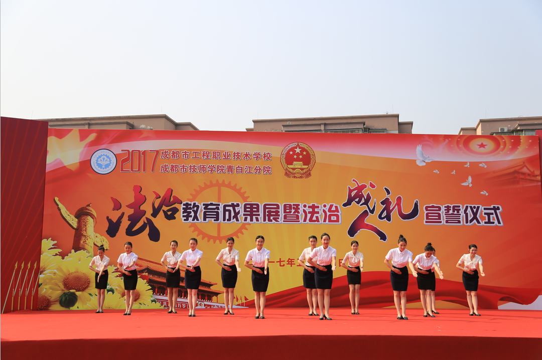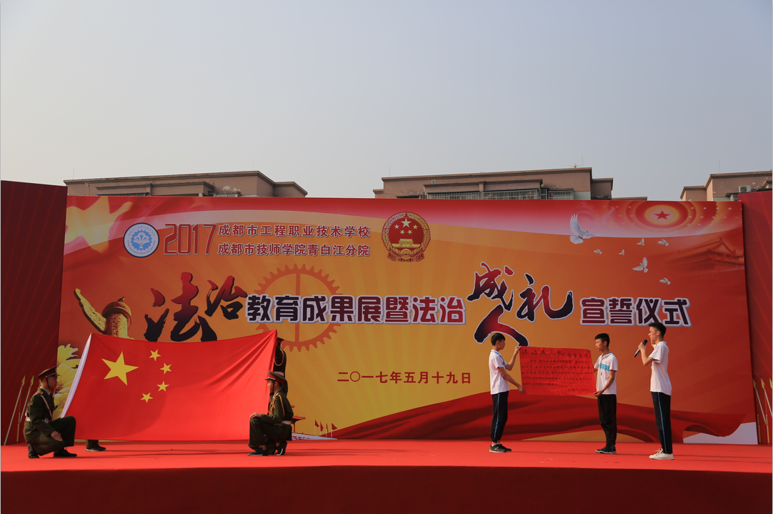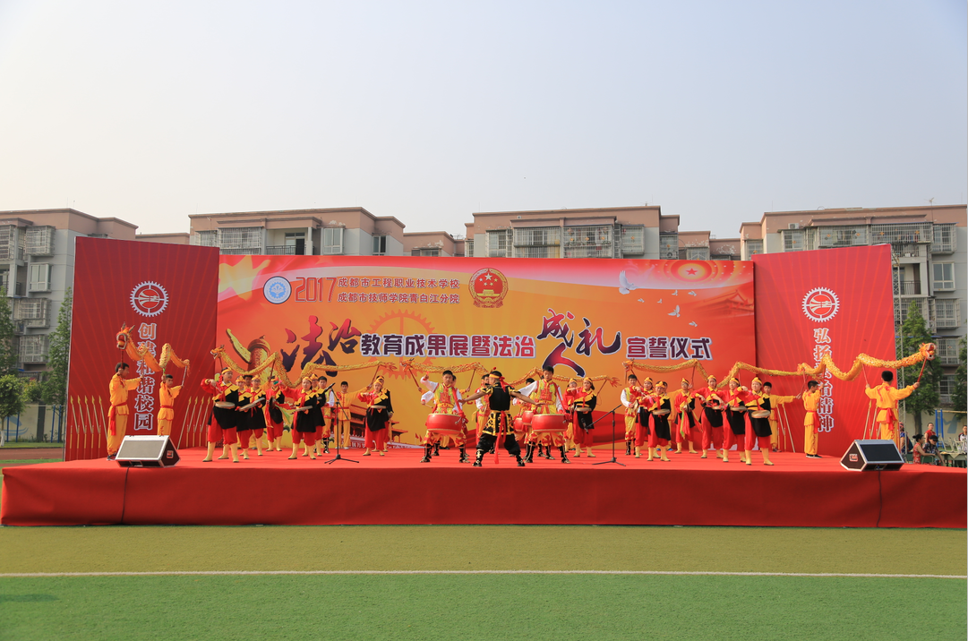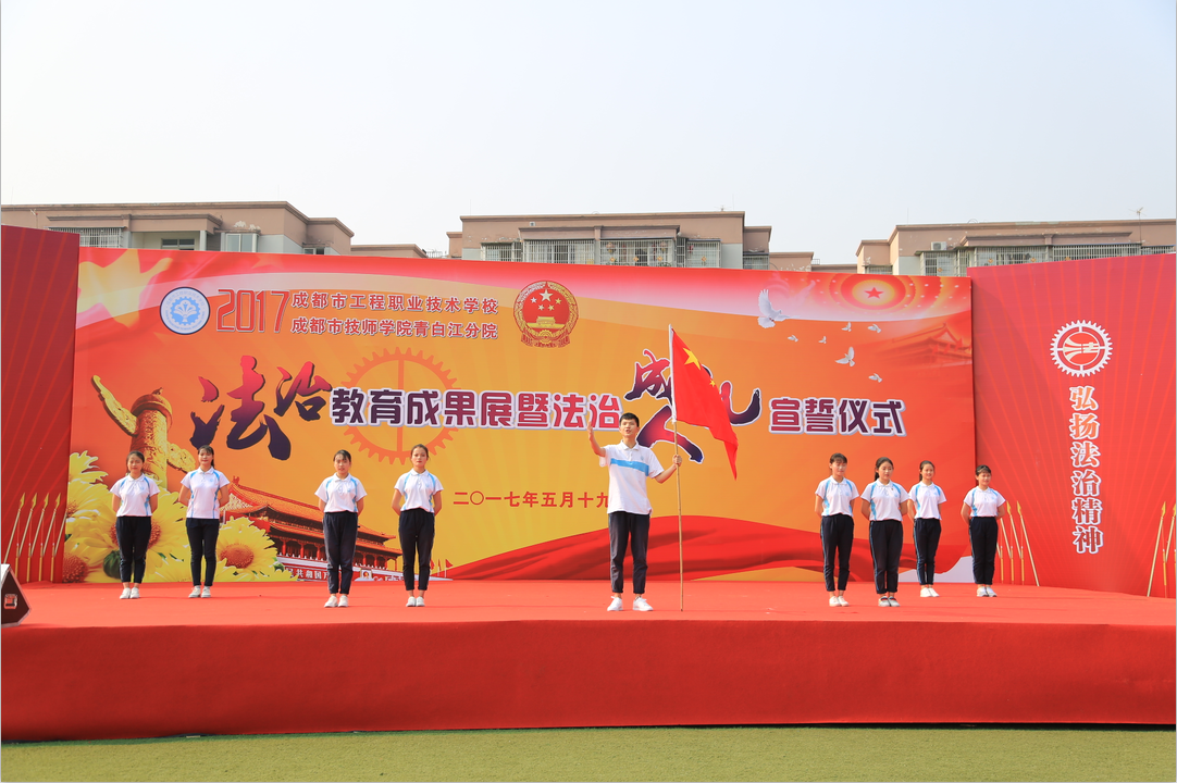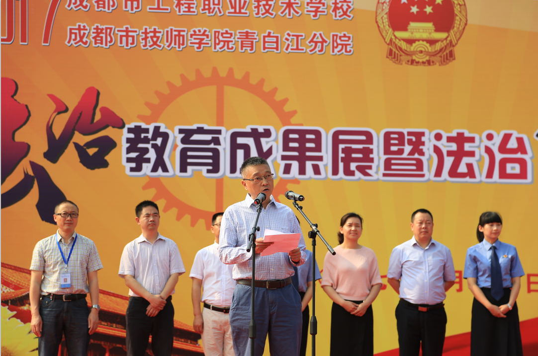 气势恢宏的《威风锣鼓》表演拉开了此次活动的帷幕。首先,全校同学面向国旗庄严宣誓,将忠于宪法和法律,尊法守法学法用法,做具备道德品质、法治素养、职业精神的新匠人。接着,学校校长助理张宗会就学校法治工作及成果进行了汇报。活动上,青白江教育局党组书记、局长郭万俊,区委办副主任、区依法治区办常务副主任嘉勇分别作了重要讲话。郭局长说,一直以来,区教育局把对学生的法治教育工作作为普法工作的重中之重,采取多种措施,培养广大师生的法律意识和权利义务意识,提高法治教育的针对性和实效性。在大力加强校园法治文化建设的同时,努力搭建家庭、学校、社会为一体的青少年法制宣传教育新平台,并有针对性地开展青少年法治宣传教育。嘉主任在讲话中提出了三点要求:一是要充分认识加强青少年法治宣传教育的重大意义,增强青少年自我防范意识、法治意识,促进学校日常管理走上法治化道路,形成一套科学的教育管理体系。二是要把法治教育与思想品德教育紧密结合,把法治教育贯穿于社会主义荣辱观教育、文明礼仪教育和校园文化建设中,为加强青少年法律意识打下扎实的思想基础。三是要充分发挥青少年法治教育基地的作用,使法治宣传教育基地成为经常化、规范化的青少年法治教育场所。最后,精彩的法治文艺节目展演将活动推向了高潮。