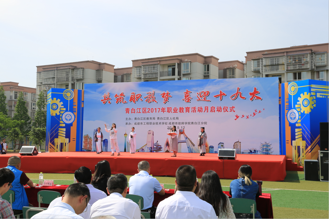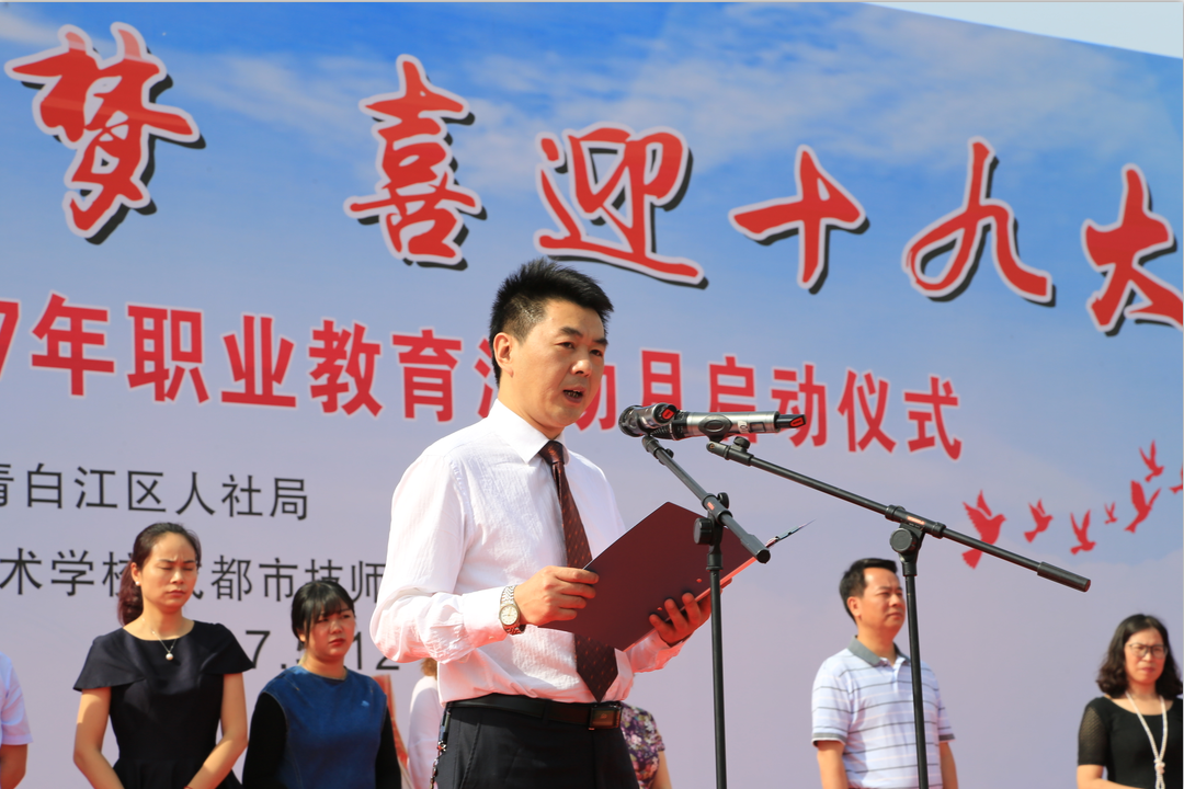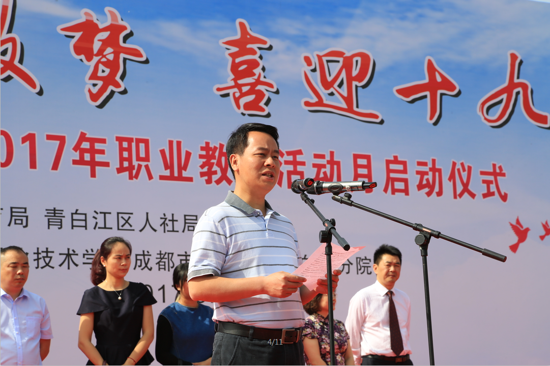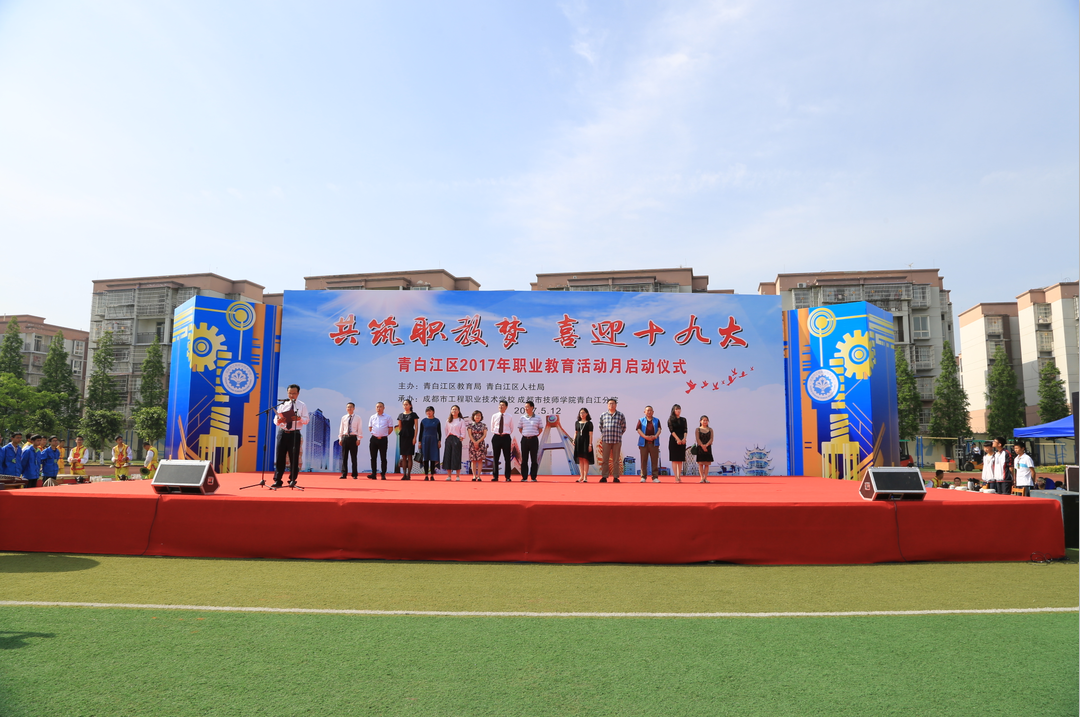 5月12日,青白江区2017年职教活动月启动仪式在我校举行。青白江区委常委、统战部长王峻昆出席启动仪式,区教育局班子成员、区人社局班子成员,区教育局科室负责人,祥福镇人大代表,行业企业代表,家长代表和全区中小学校(幼儿园)校(园)长以及成都市工程职业技术学校、成都市技师学院青白江分院全体教师和同学参加了此次启动仪式。启动仪式由青白江区人社局党组书记、局长陈智彬主持。